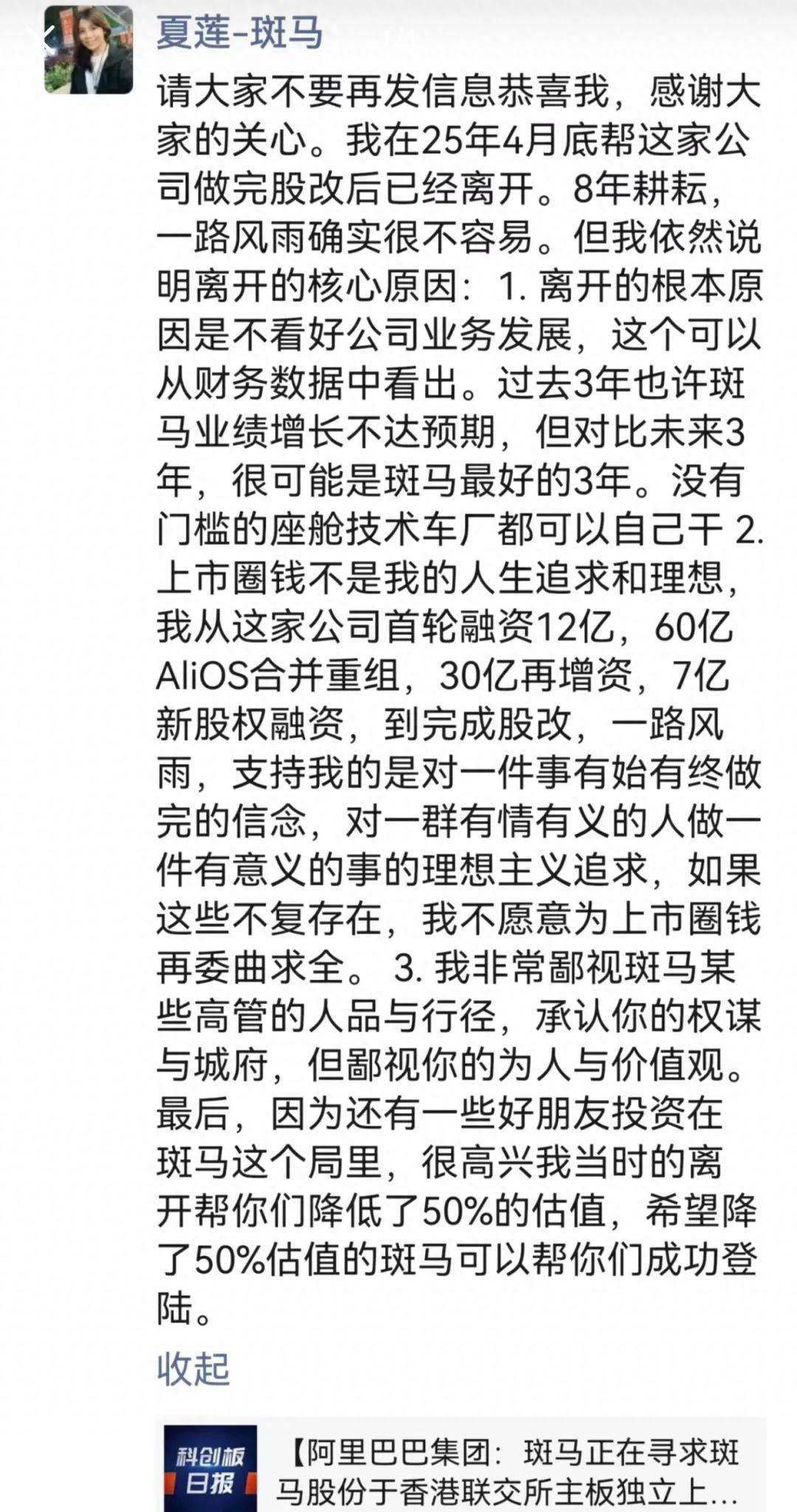 DoNews8月21日音问,原斑马集中CFO夏莲在一又友圈发文点评阿里巴巴将把斑马分拆赴港上市。与一般高管祝愿老东家行将上市不同,夏莲在一又友圈的点评却是颇有不少「负面」厚谊。