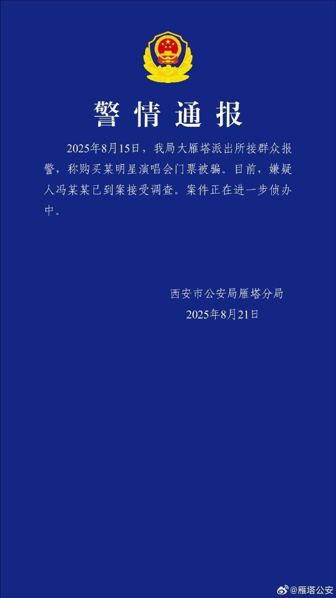 2025年8月15日,我局大雁塔派出所接宇宙报警,称购买某明星演唱会门票被骗。当今,嫌疑东说念主冯某某已到案领受打听。案件正在进一步侦办中。