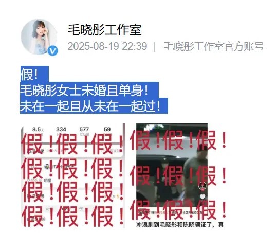 8月19日晚,毛晓彤责任室强势发文,否定了与陈晓的恋情神话,直言“假!毛晓彤女士未婚且独身!未在统统且从未在统统过!”这一恢复赶快激发烧议,关系话题顷刻间登上娱乐热搜榜首。